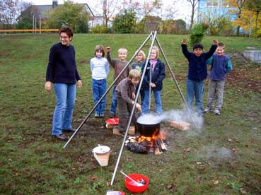 Frau Zink bereitete mit ihrer dritten Klasse die Kartoffelsuppe über dem offenen Feuer zu.